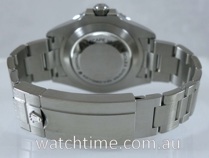 Stainless-steel Oyster case with unidirectional rotatable bezel, scratch-resistant Cerachrom insert in ceramic, numerals and graduations coated in platinum. Triplock screw-down crown. Sapphire crystal