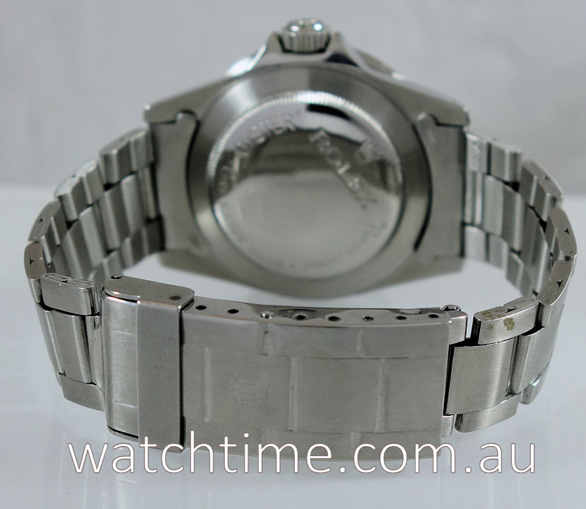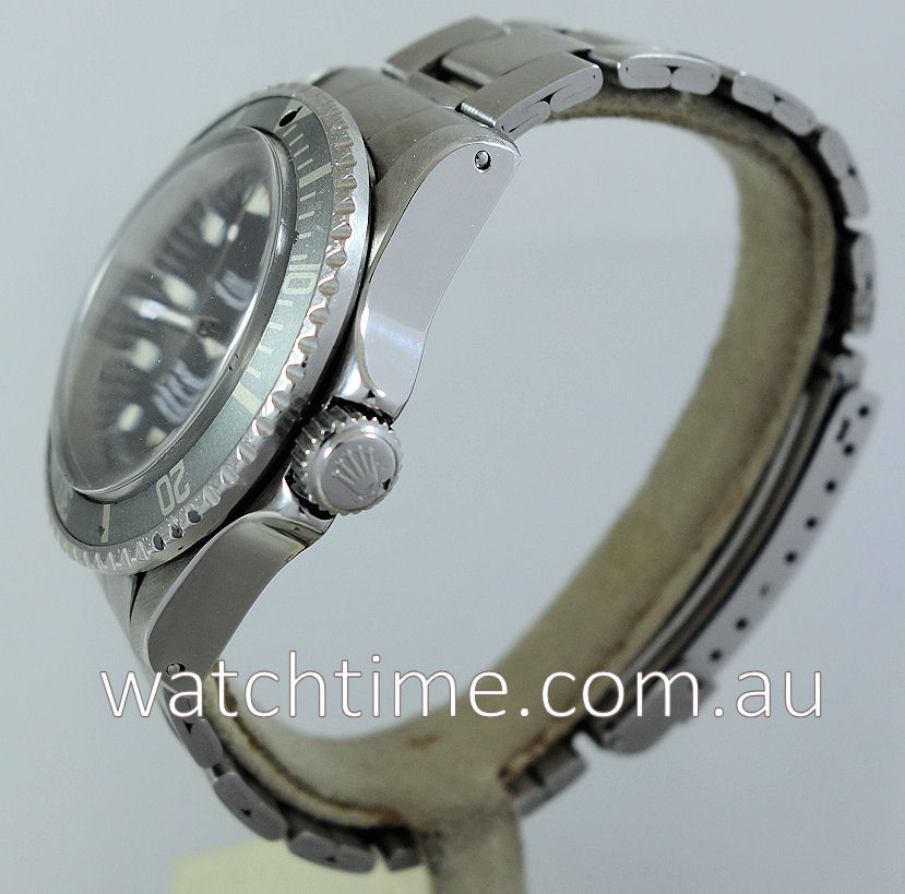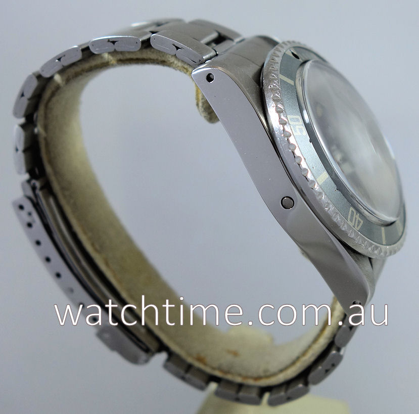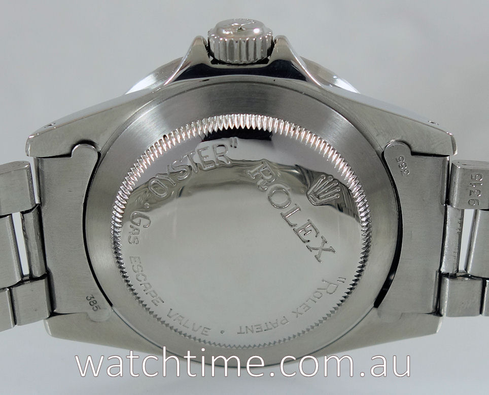 Stainless-steel Oyster case with bi-directional turning diver’s bezel and screw-in crown. Domed plexiglas. Case-back feat. “ROLEX” printed straight across the back.
