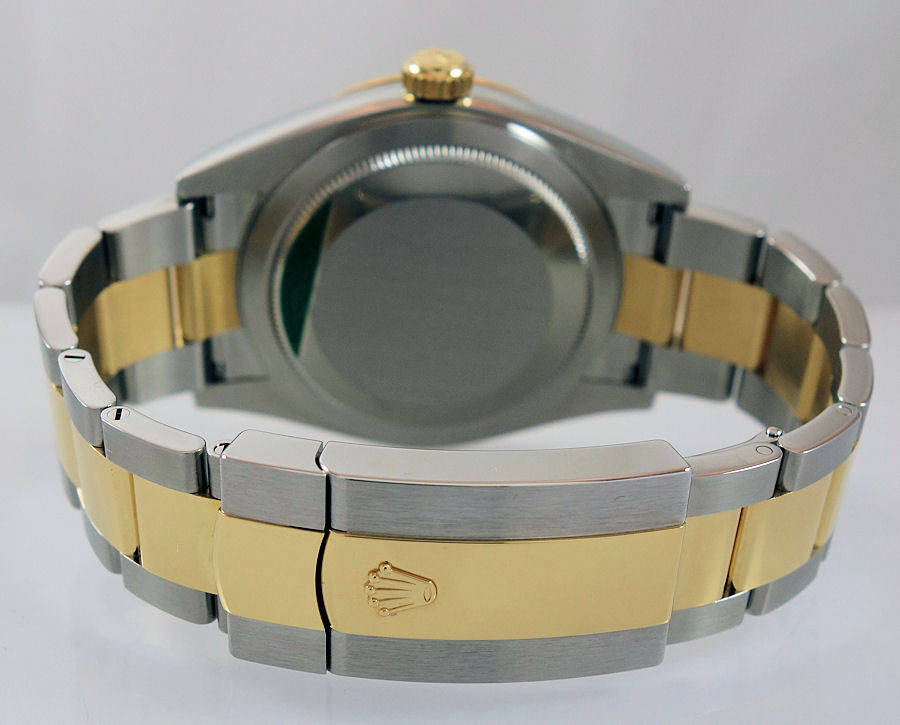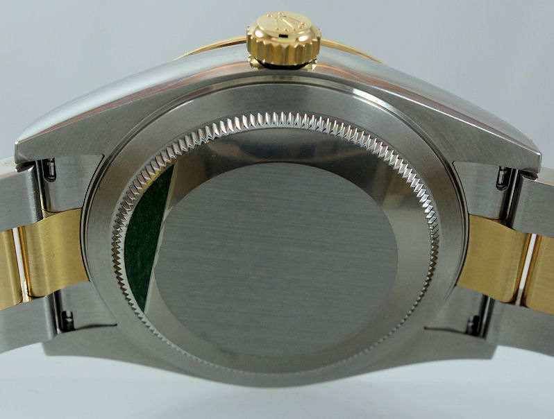 Oyster case in Stainless-steel with 18k Yellow-Gold bezel, screw-down crown and Sapphire crystal glass.