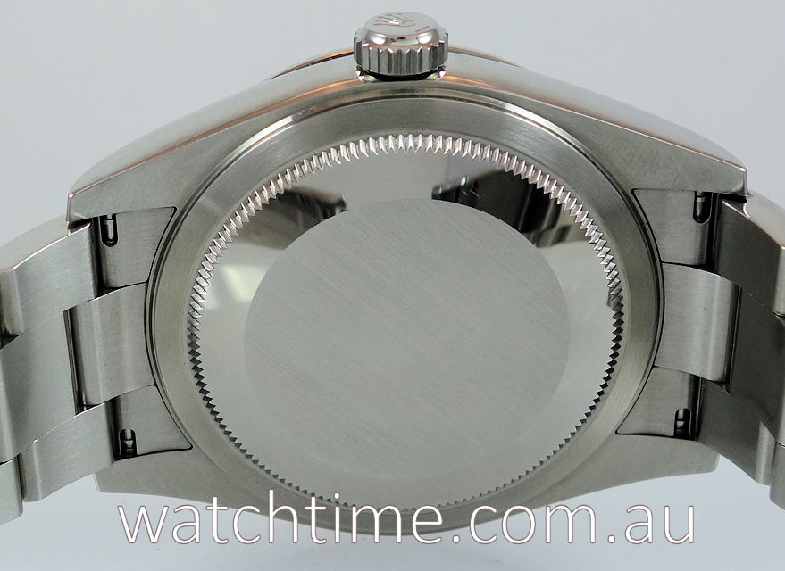 Stainless-steel Oyster case with screw-winding crown, sapphire crystal glass and 18k White-Gold fluted bezel.