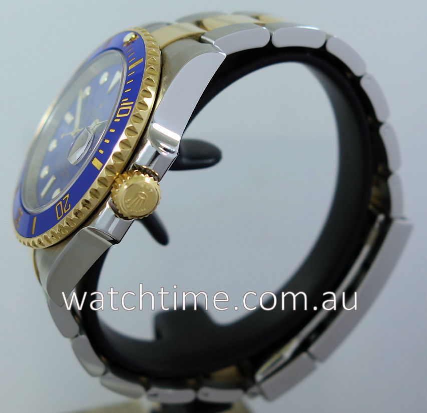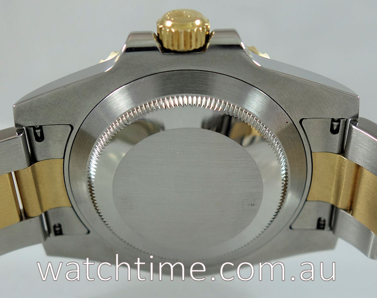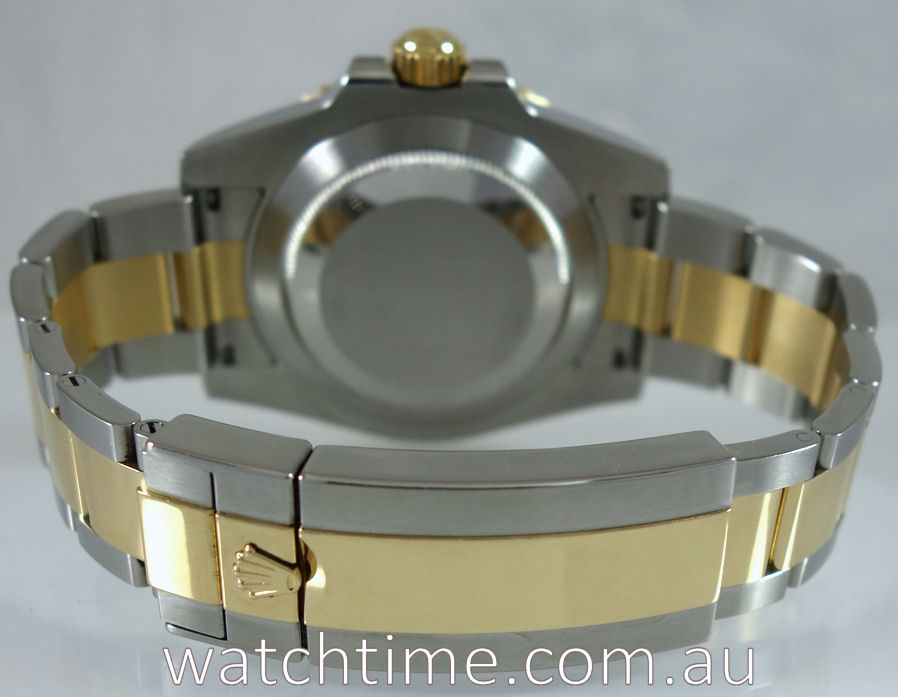 Stainless-Steel Oyster case with 18k Yellow-Gold and blue Ceramic bezel. Sapphire crystal glass. Triplock screw-down winding crown.