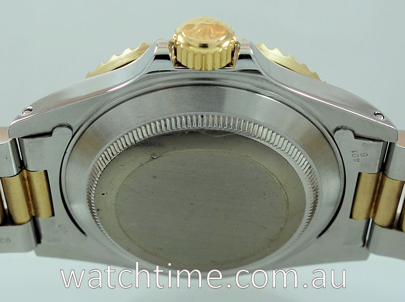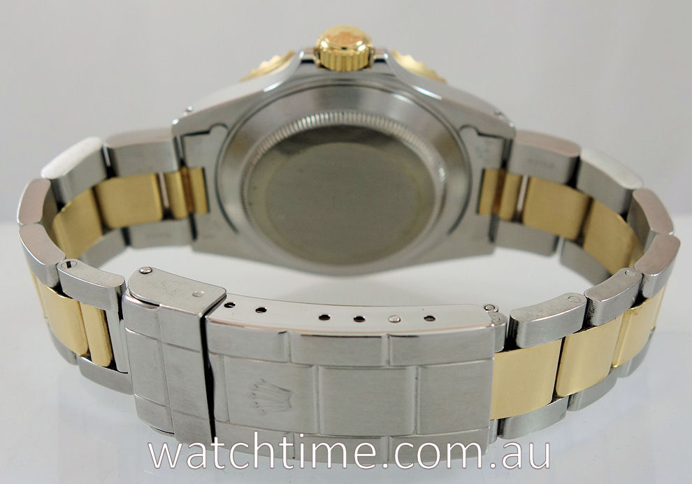 | Case | Stainless-steel Oyster case with screw down winding crown and 18k Yellow-Gold uni-directional rotating diver’s bezel. Sapphire crystal glass with cyclops over the date for magnification. |