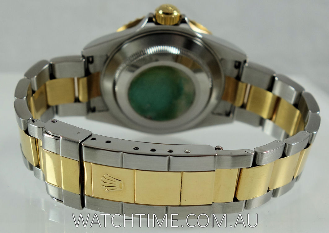 | Case | Stainless-steel Oyster case with screw down winding crown and 18k Yellow-Gold uni-directional rotating diver’s bezel. Sapphire crystal glass with cyclops over the date for magnification. |