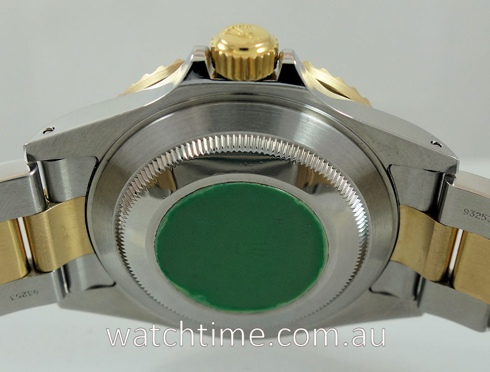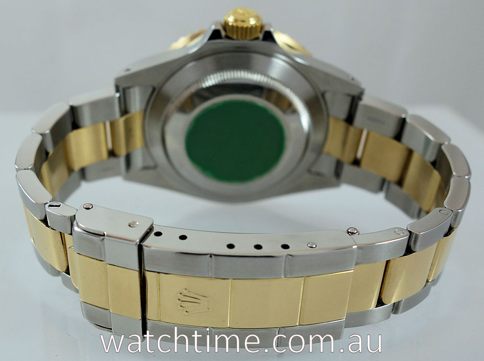 | Case | Stainless-steel Oyster case with screw down winding crown and 18k Yellow-Gold uni-directional rotating diver’s bezel. Sapphire crystal glass with cyclops over the date for magnification. |