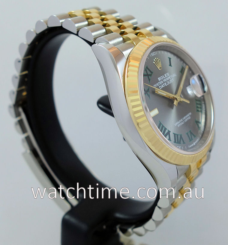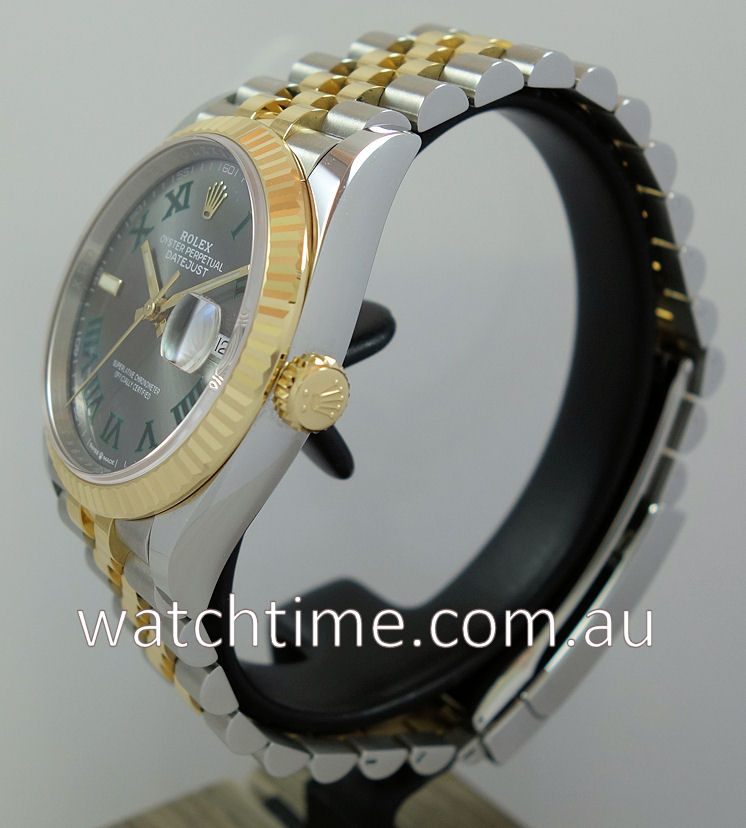 | Dial | ” Wimbeldon” Slate-grey sunburst dial with black / green Roman numbers, gold / luminous hands and date at 3 o’clock. |