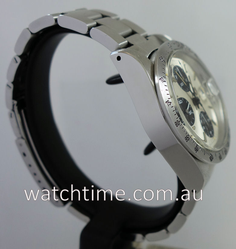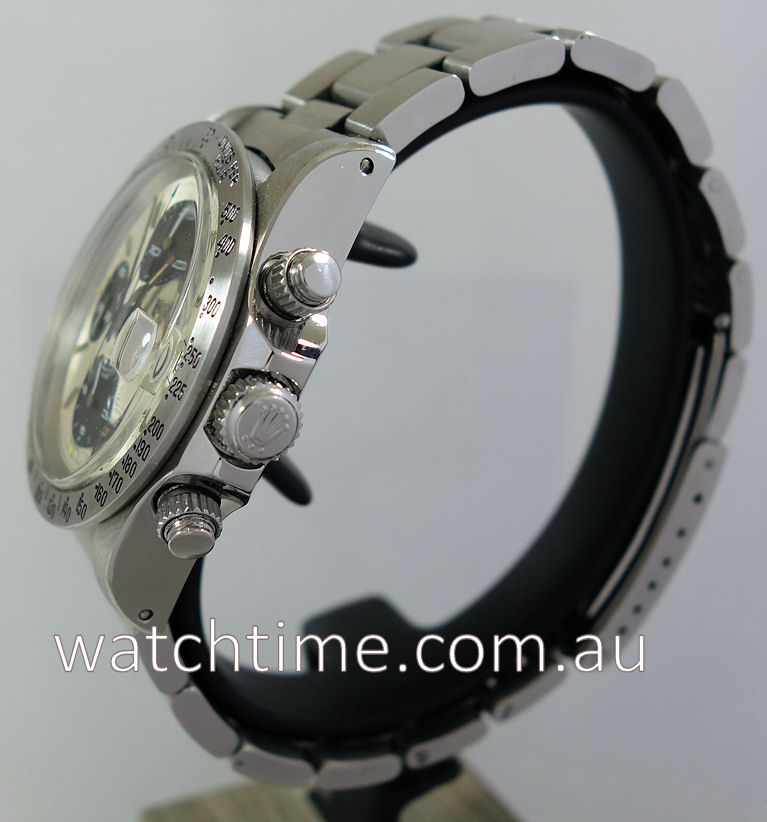 | Case | Stainless-steel “Big Block” Oyster case with screw-down pushers and crown, fixed Tachymeter bezel and plexiglas. Crown and case-back are Rolex signed. |