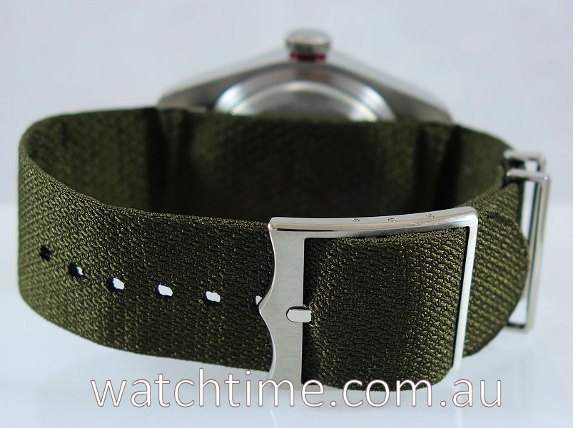 Brushed & polished Steel case with domed crystal. Screw-down “Big Crown” featuring the Tudor rose emblem and a coloured, anodized aluminium crown tube. Warm Burgundy rotating bezel.