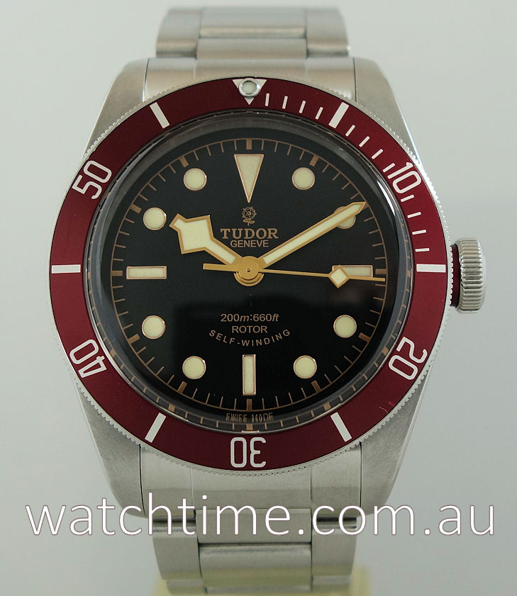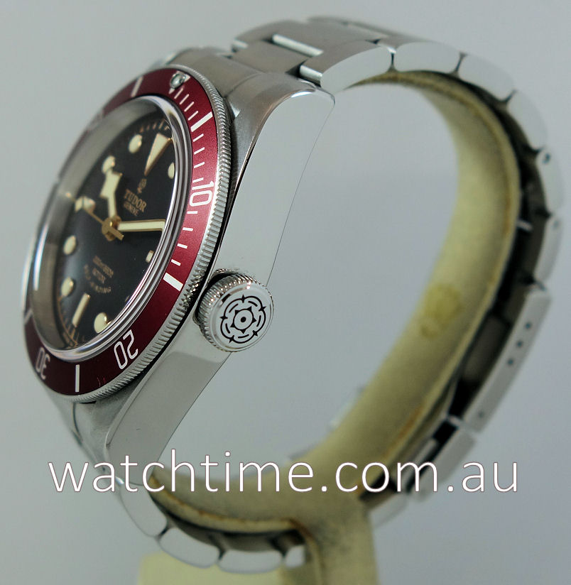 | Case | Brushed & polished Steel case with domed crystal. Screw-down “Big Crown” featuring the Tudor rose emblem and a coloured, anodized aluminium crown tube. Warm Burgundy rotating bezel. |
