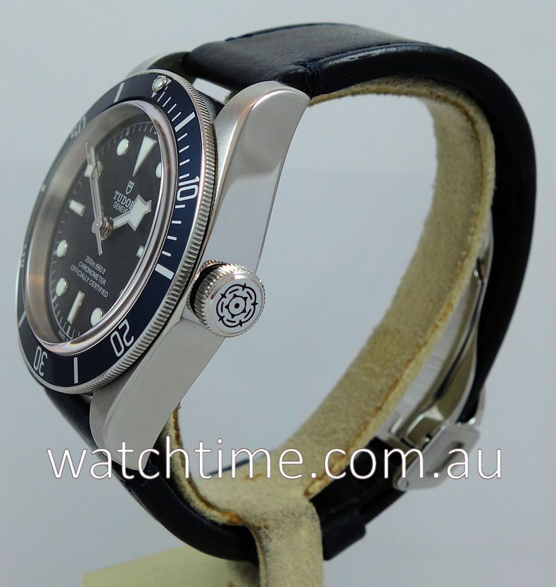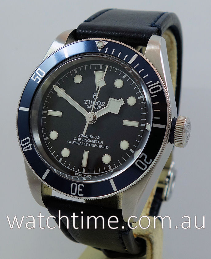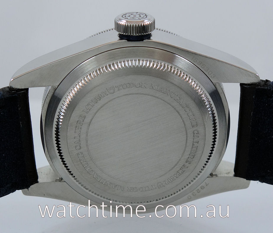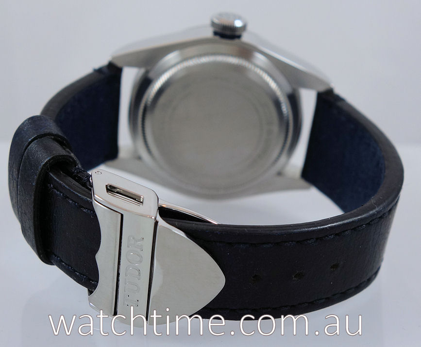 | Band | Blue leather with steel fliplock clasp by Tudor. Additional NATO fabric strap. |