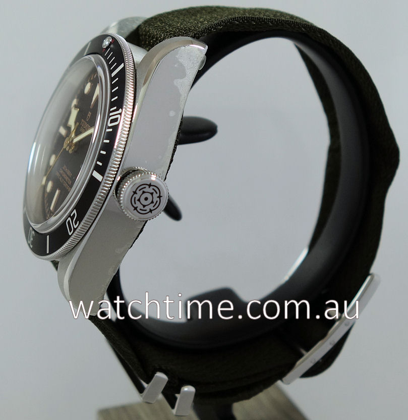 | Case | Brushed & polished Steel case with domed crystal. Screw-down “Big Crown” featuring the Tudor rose emblem and a coloured, anodized aluminium crown tube. Black rotating bezel with red accent at 12 o |