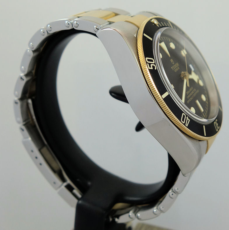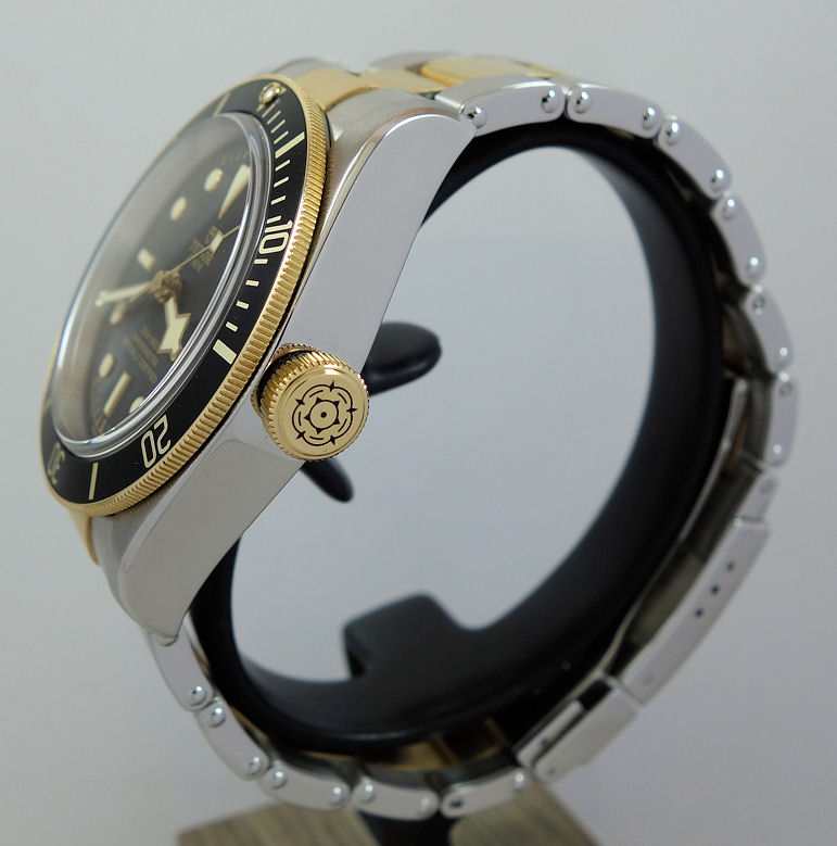 Brushed & polished Steel case with domed crystal. Screw-down “Big Crown” featuring the Tudor rose emblem and a coloured, anodized aluminium crown tube. 18k Yellow-Gold rotating bezel with black in