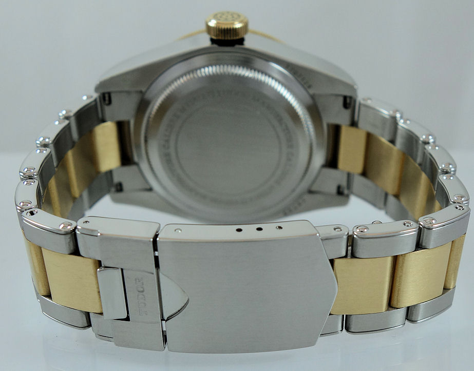 Black dial with gilt lettering and minute track, gold hands and luminous markers. “Snowflake” hand for hours reminiscent of 1970s models.