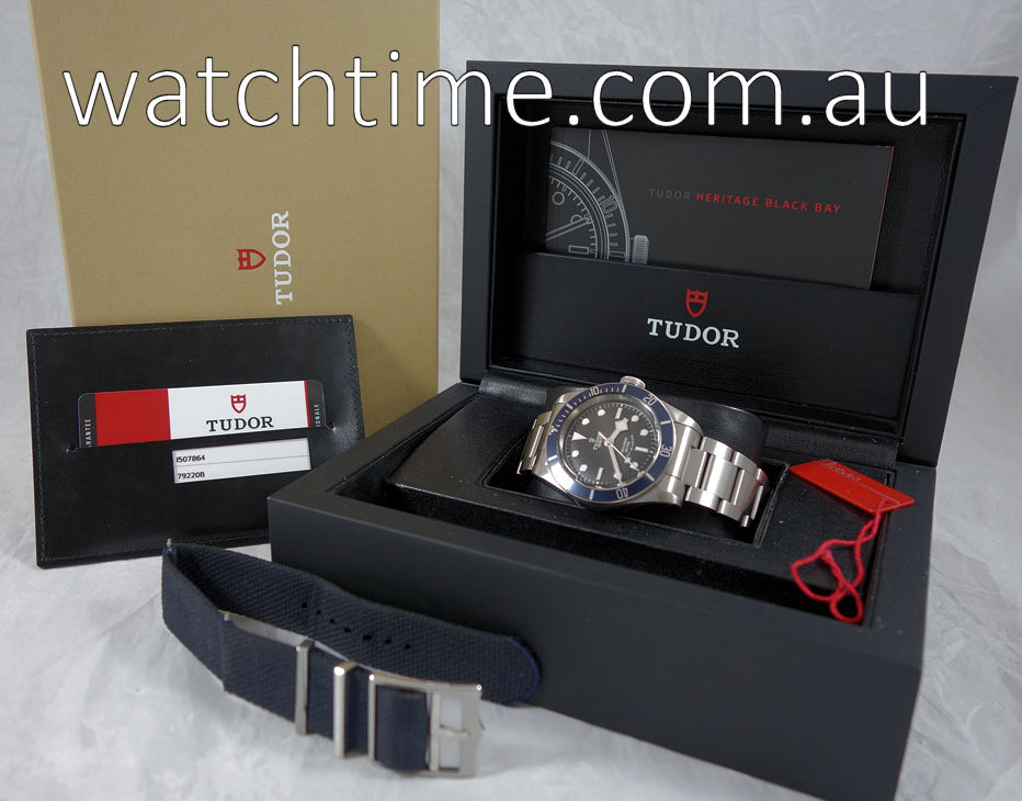 | Band | Stainless-steel bracelet with flip-lock clasp by Tudor. Extra fabric strap in Navy-Blue with steel buckle. |