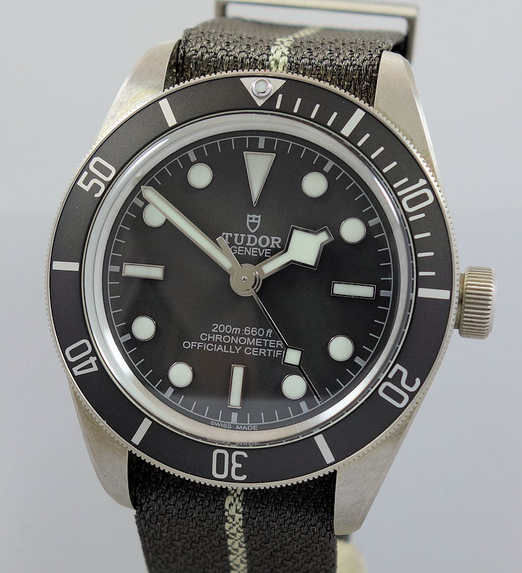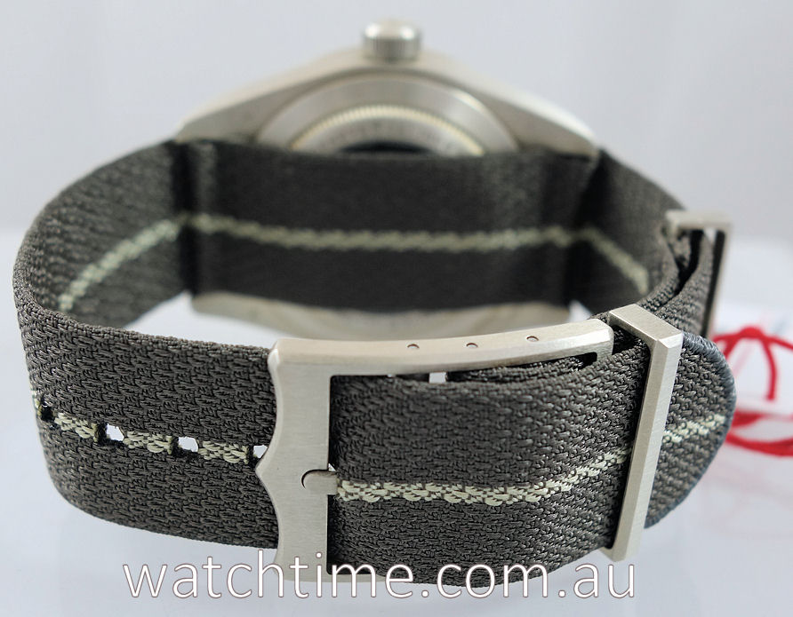 Taupe fabric strap and pin buckle by Tudor.