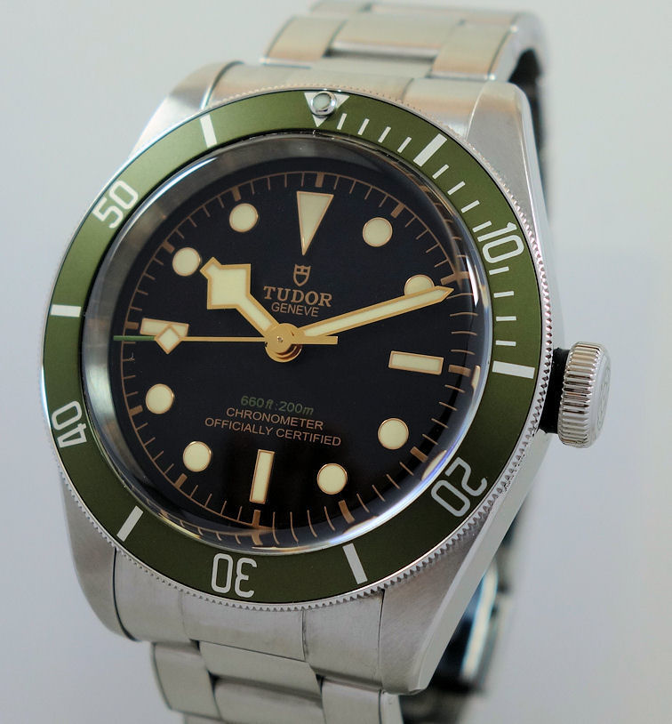 Brushed & polished Steel case with domed crystal. Screw-down “Big Crown” featuring the Tudor rose emblem. Special GREEN insert in the rotating bezel.