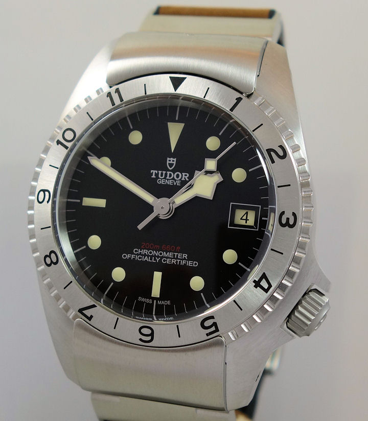 Black dial with luminous hours and snowflake hour hand. Date at 3 o’clock.