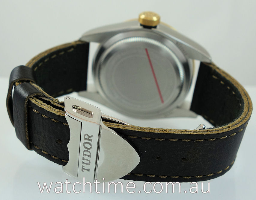 | Band | Dark brown leather and steel flip-lock clasp by Tudor. |