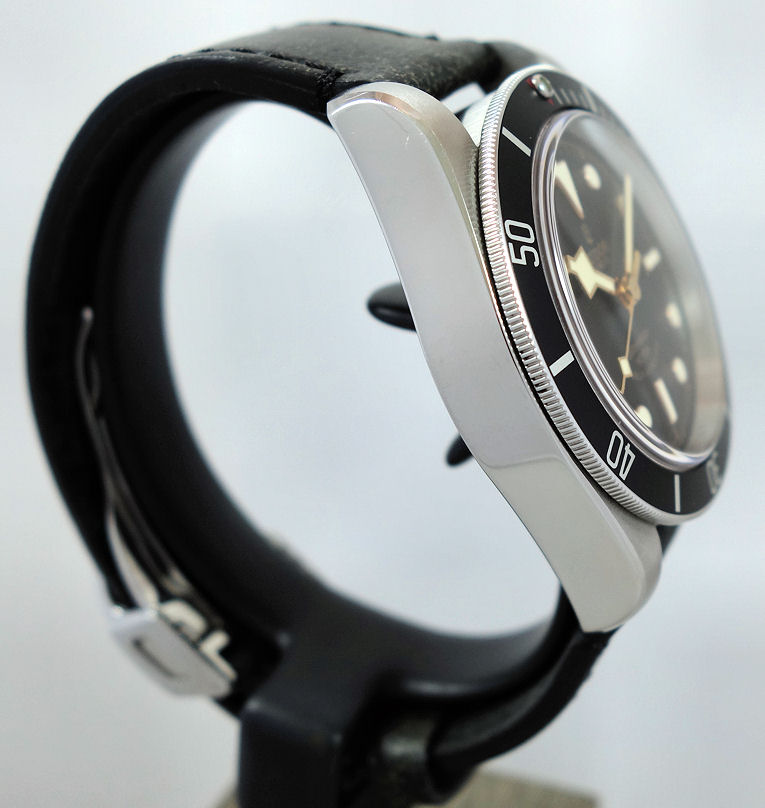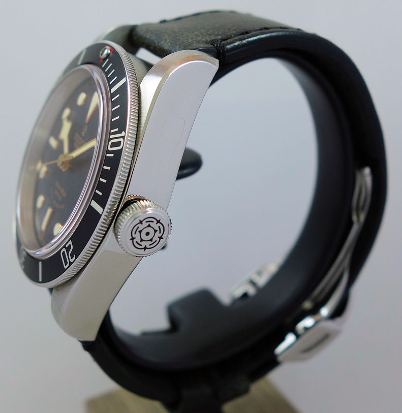 TUDOR’S Heritage Black Bay features lines inspired by the TUDOR Submariner, which was first launched in 1954. The Black Bay has similar features including it’s slender, elongated lugs, domed crystal and vintage style dial; with “smiley” script above 6 o’clock.