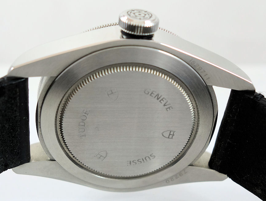 Brushed & polished Steel case with domed crystal. Screw-down “Big Crown” featuring the Tudor rose emblem and a coloured, anodized aluminium crown tube. Black rotating bezel with red accent at 12 o