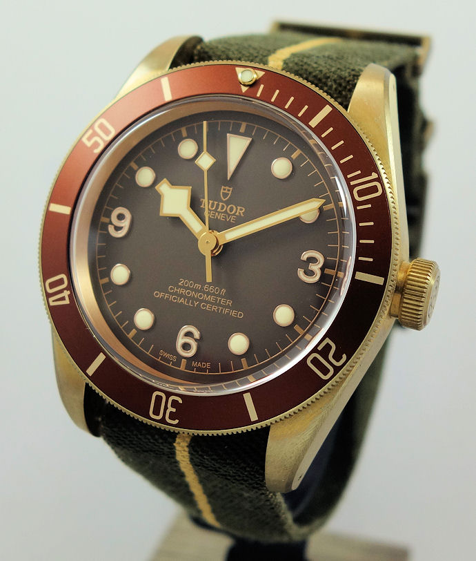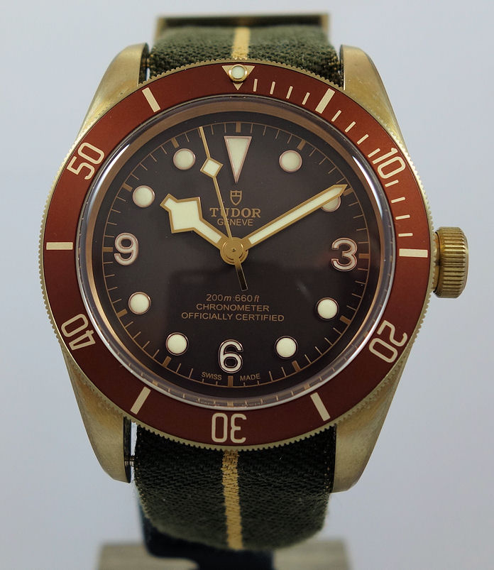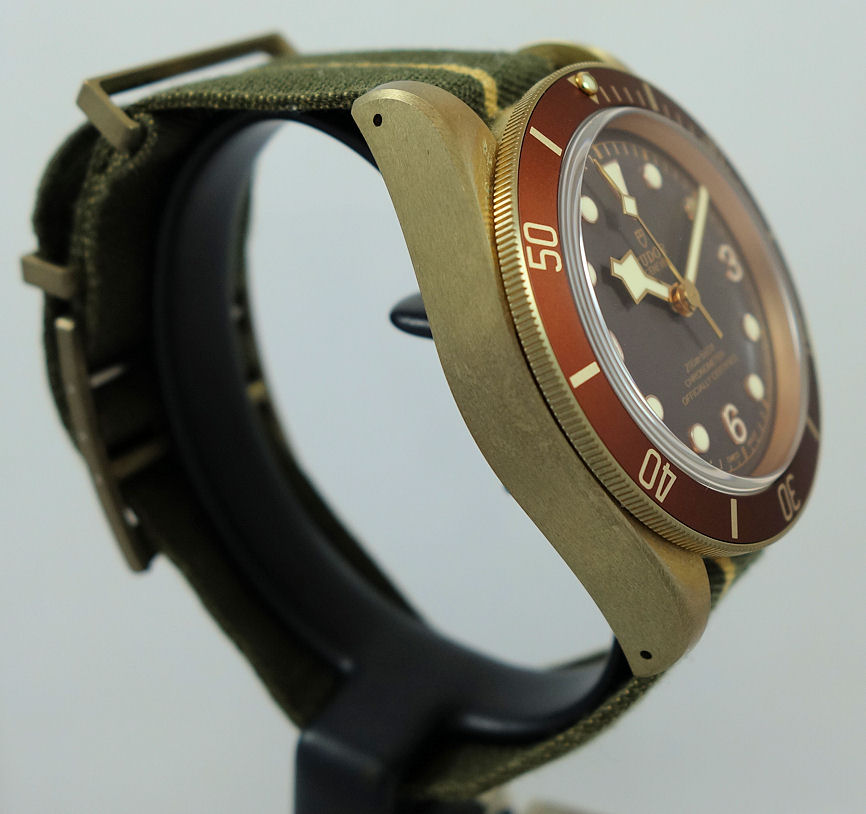 | Case | Satin-brushed Bronze case with steel-back in bronze-tone. Bronze bezel with brown insert. Domed sapphire crystal glass. |