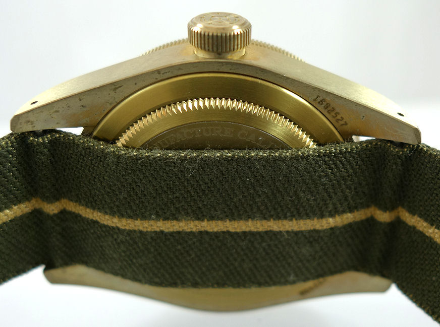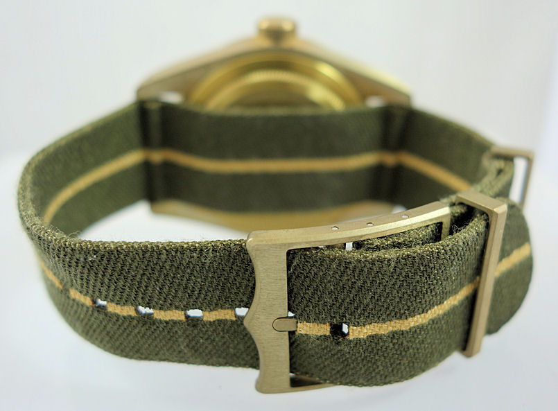 | Band | Khaki woven fabric strap with gold stripe and bronze hardware / buckle. No leather band. |