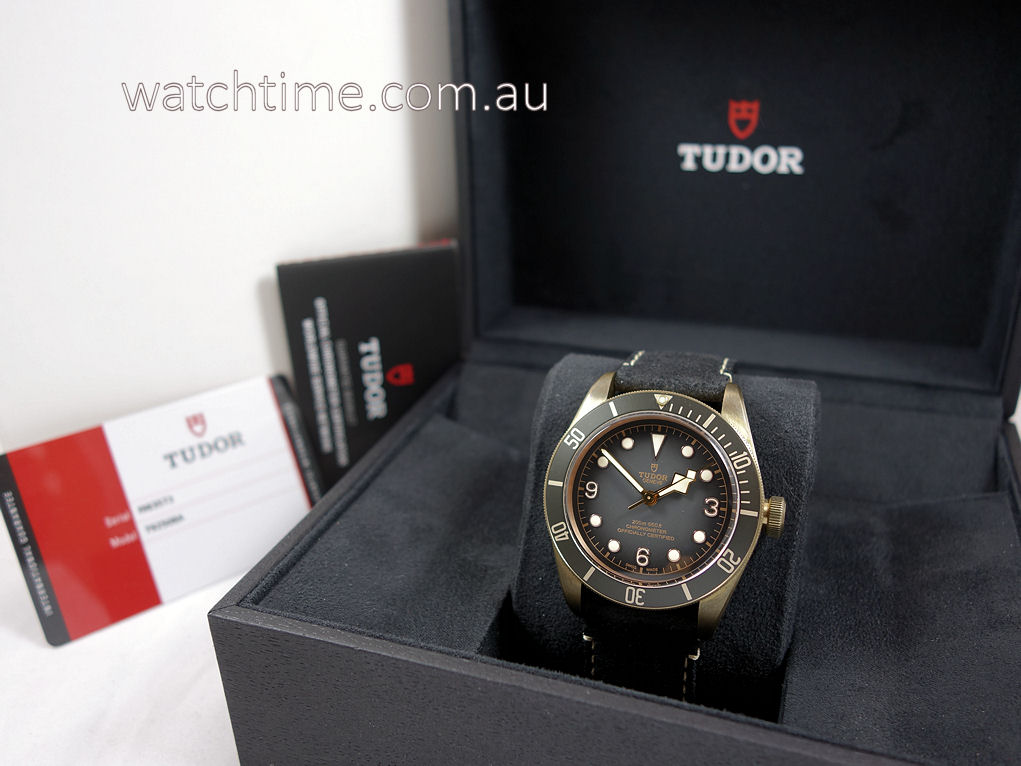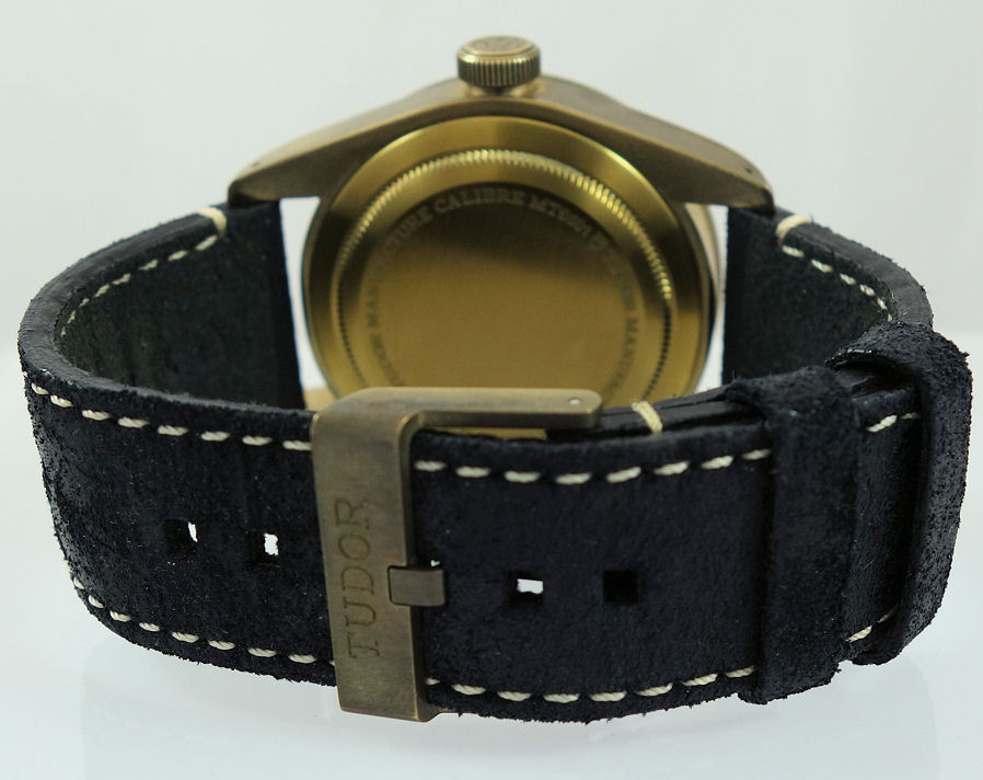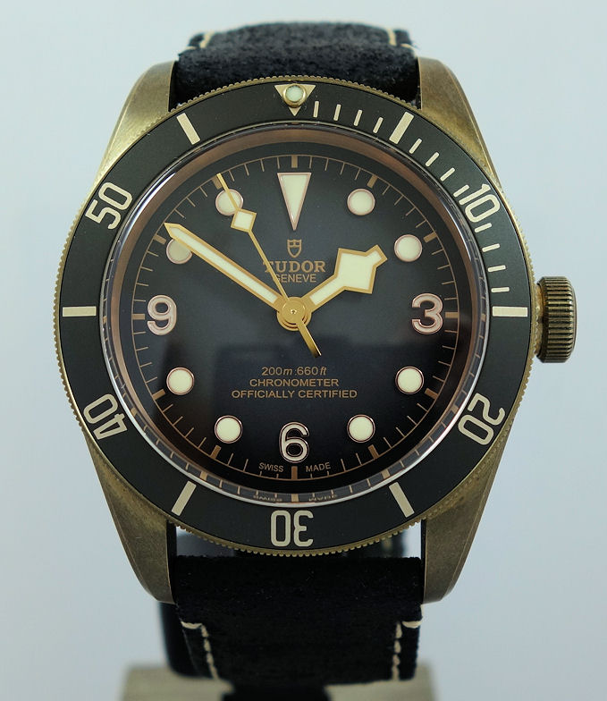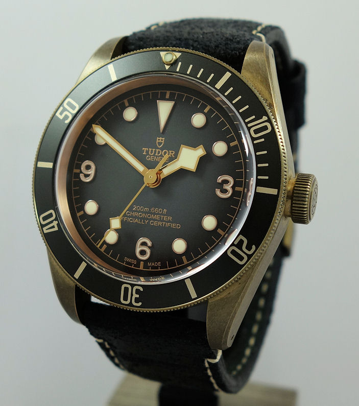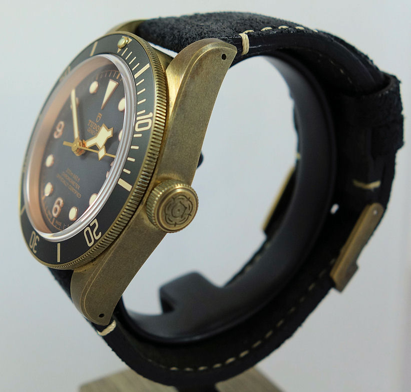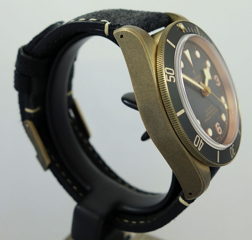 | Case | Bronze with screw-down crown, bronze rotating bezel with black and gold insert. Domed Sapphire crystal glass. |