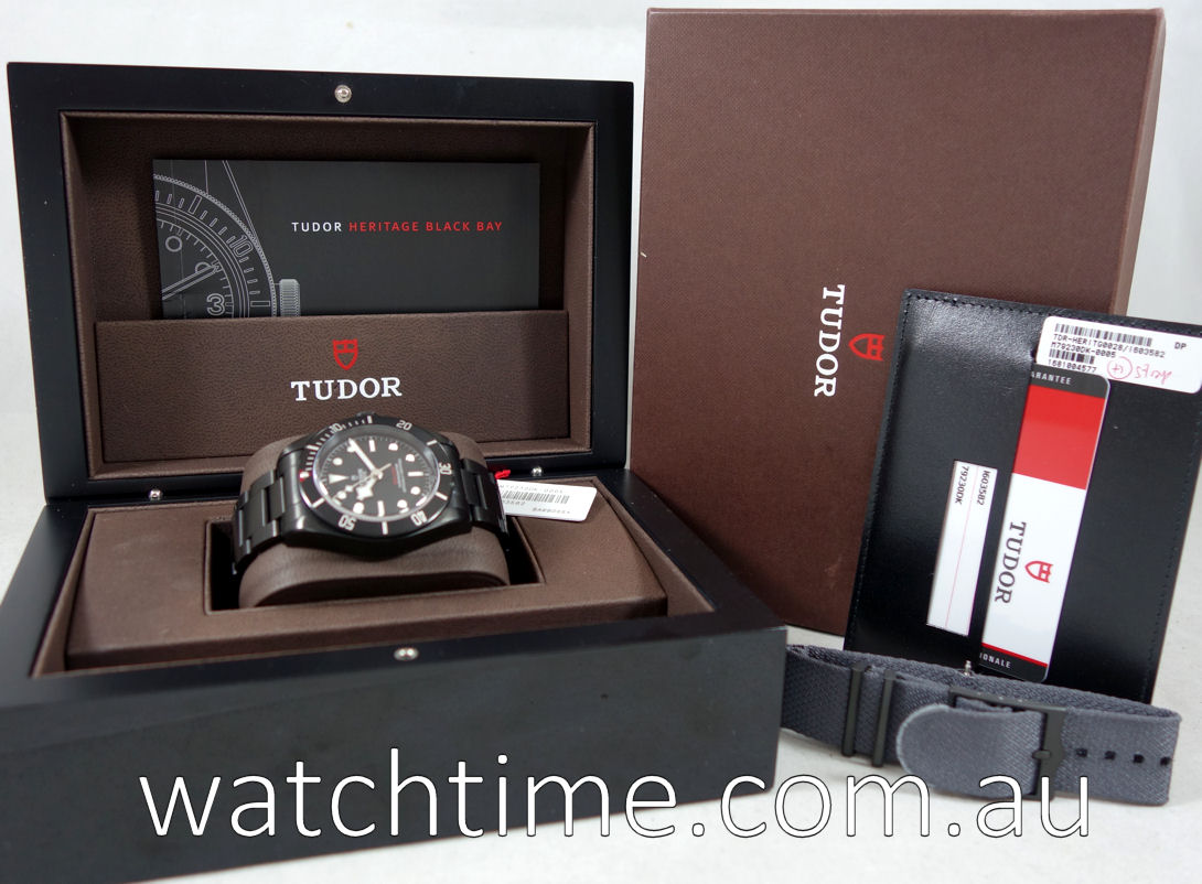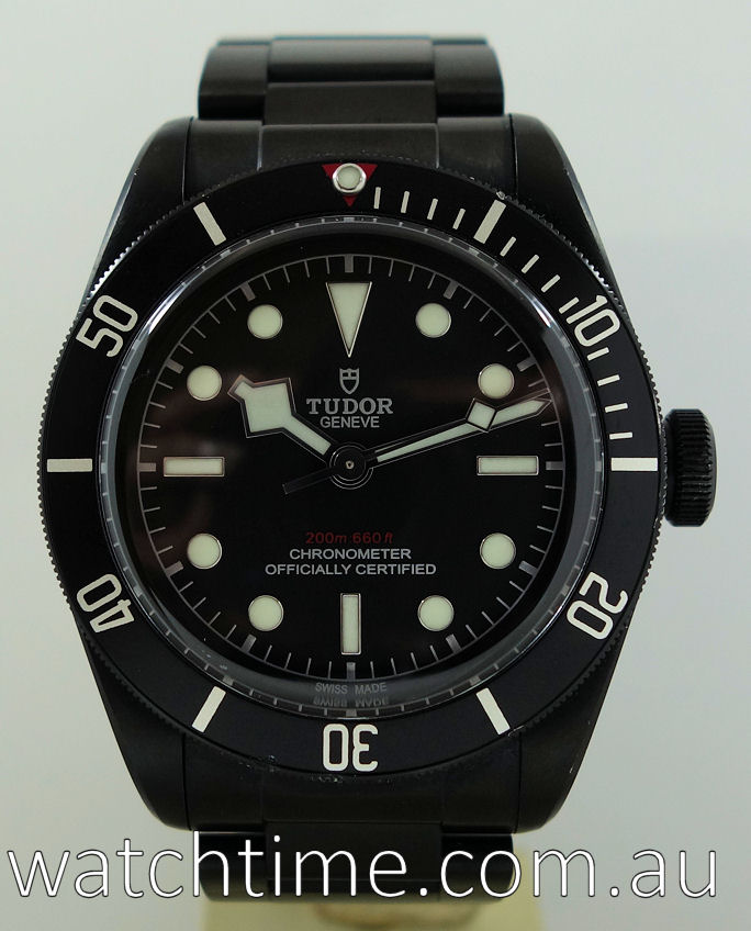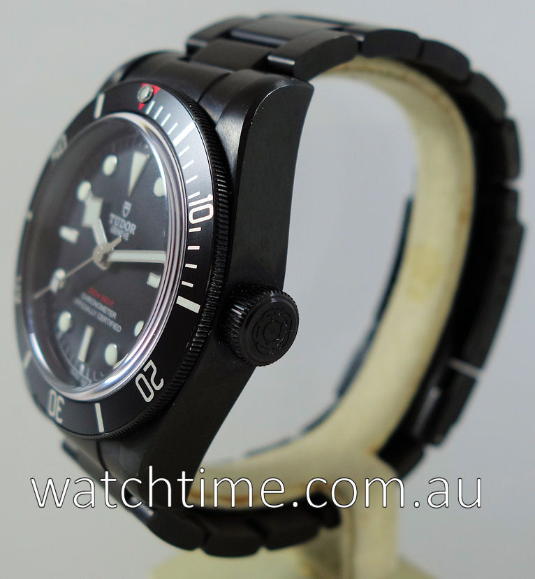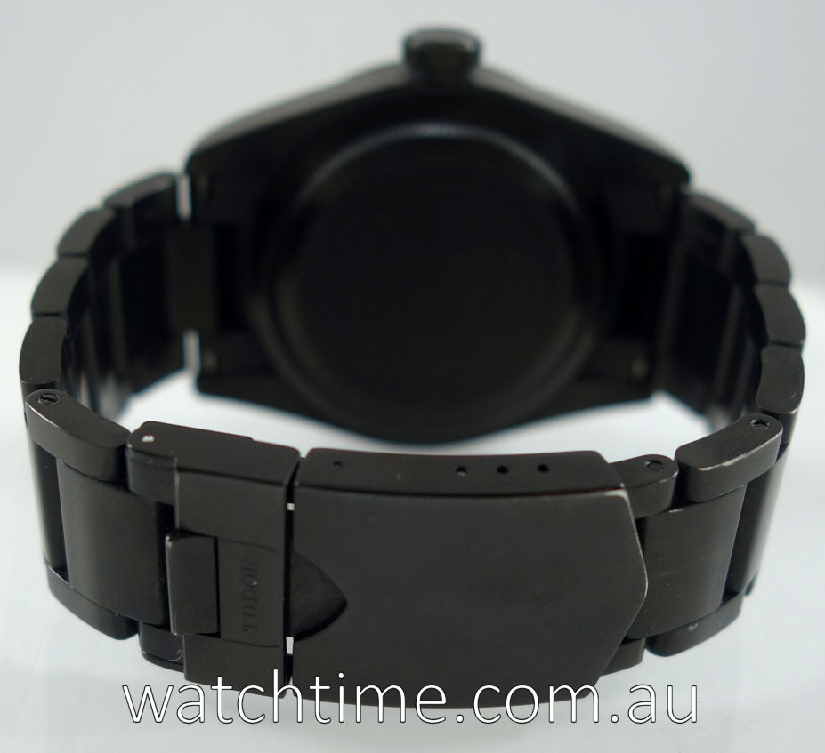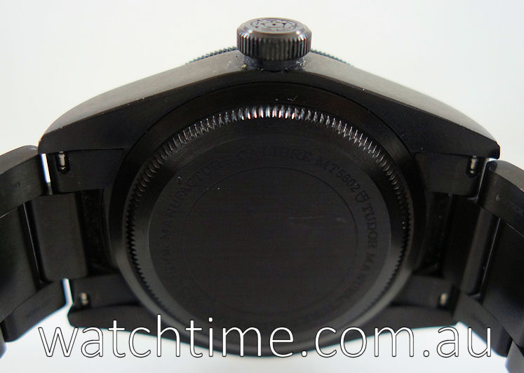 | Case | Black PVD Steel case case with domed crystal, screw-down “Big Crown” featuring the Tudor rose emblem and a coloured, anodized aluminium crown tube. Black rotating bezel with matte black disc. |