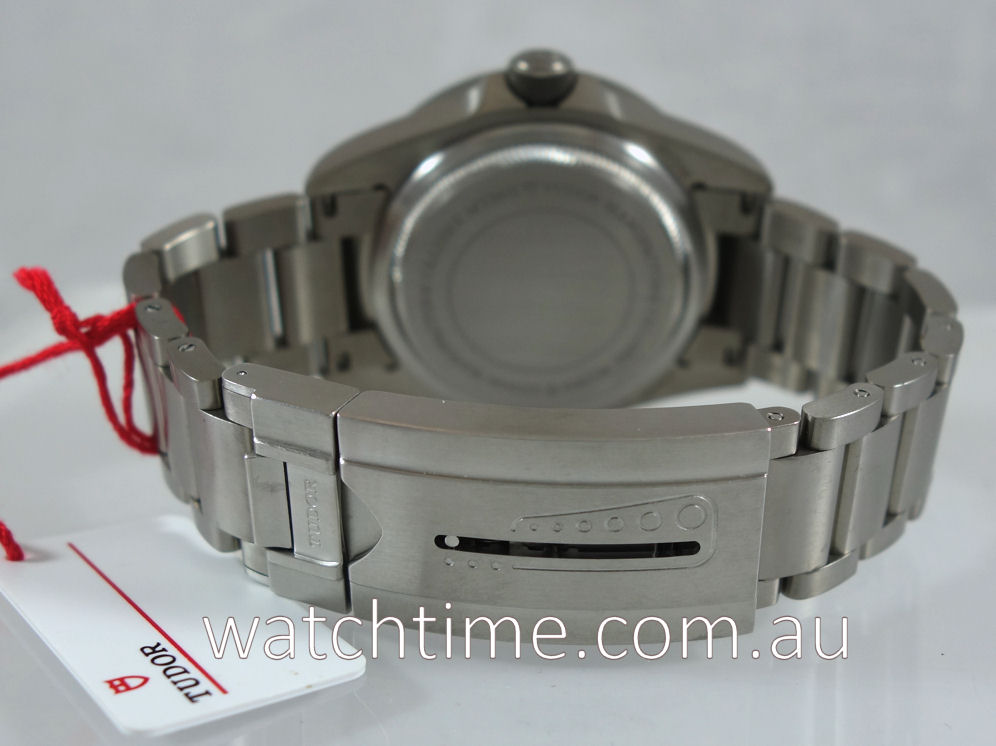 | Band | Satin-finish Titanium bracelet with patented expansion-style clasp in steel. Additional blue diver extension rubber strap and pin-buckle by Tudor. |