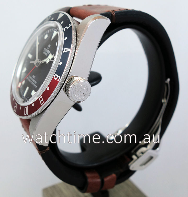 | Case | Brushed & polished Steel case with domed Sapphire crystal. Screw-down “Big Crown” featuring the Tudor rose emblem. Rotating bezel with “matt burgundy and blue” 24 hour insert. |