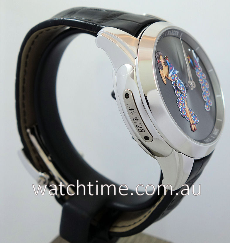 | Case | Polished platinum case with Sapphire crystal top and display back. Two push-buttons for hour striking / jacquemarts. |