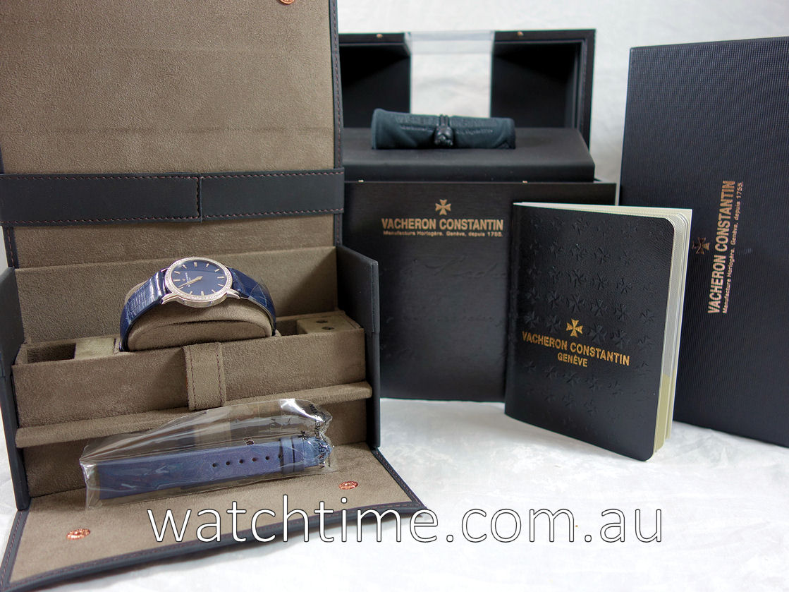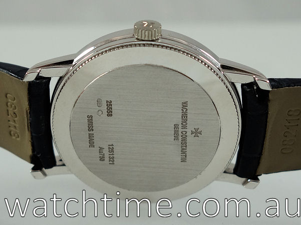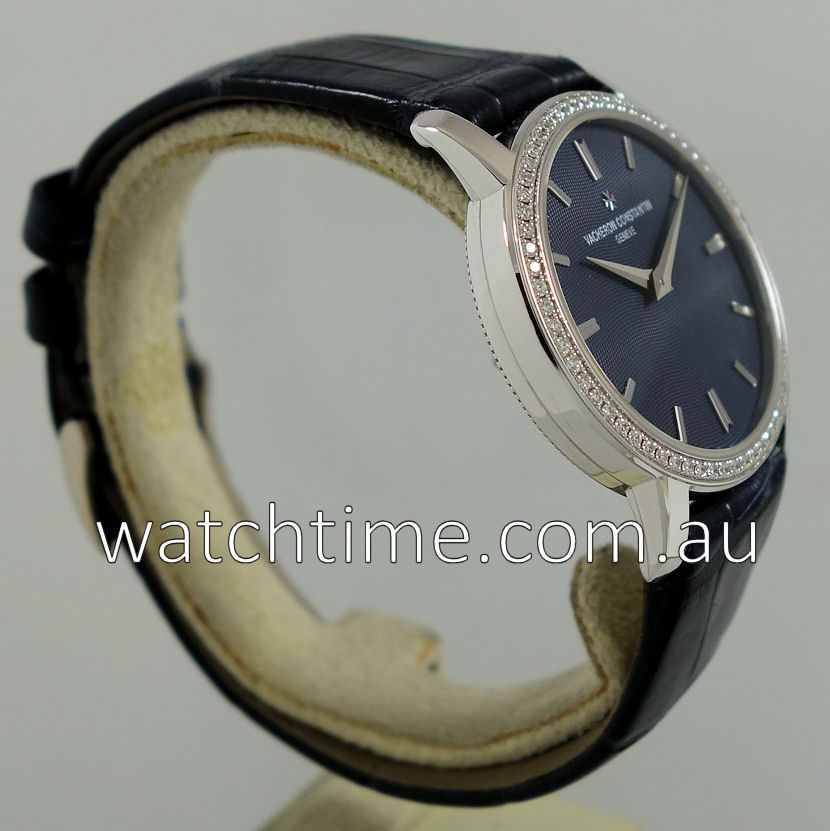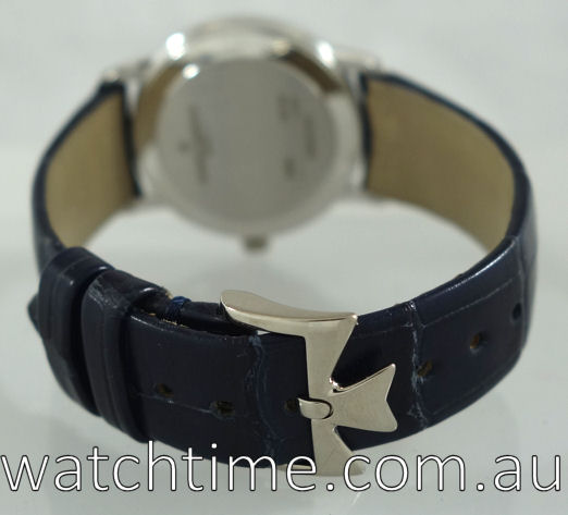 | Band | Blue Alligator with 18ct White Gold pin buckle by VC. Additional Blue Satin strap (unused). |