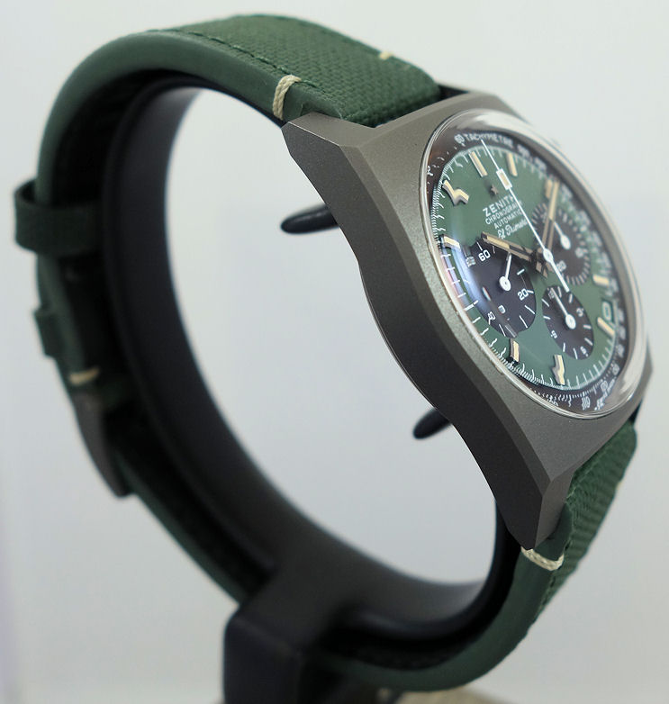 | Dial | Khaki green with black subdials, beige lume in the hands & hours and date window between 4/5 o’clock. |