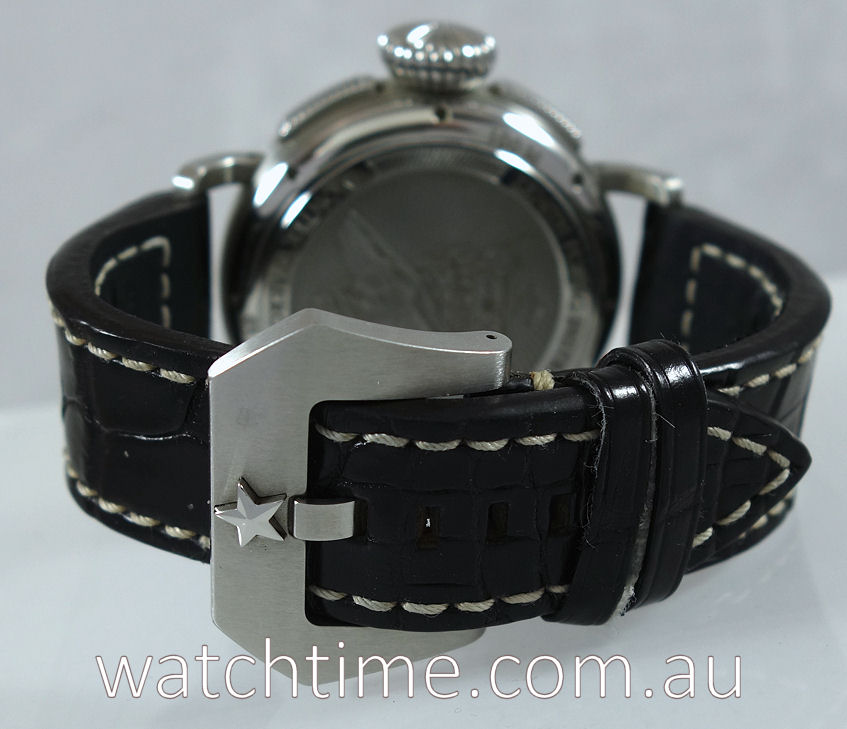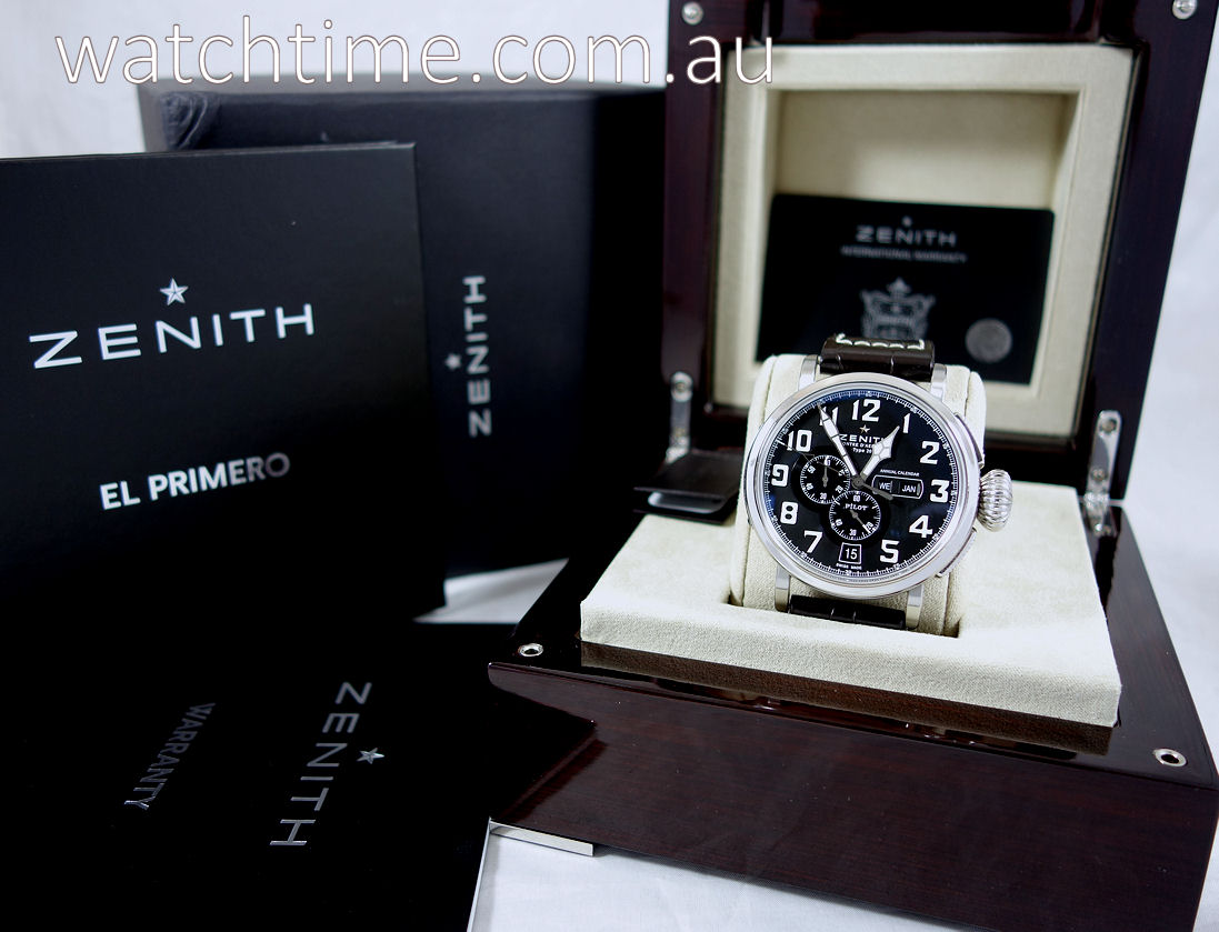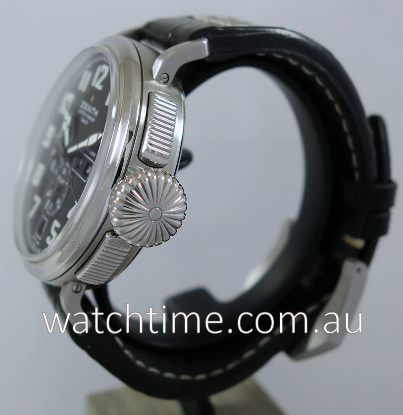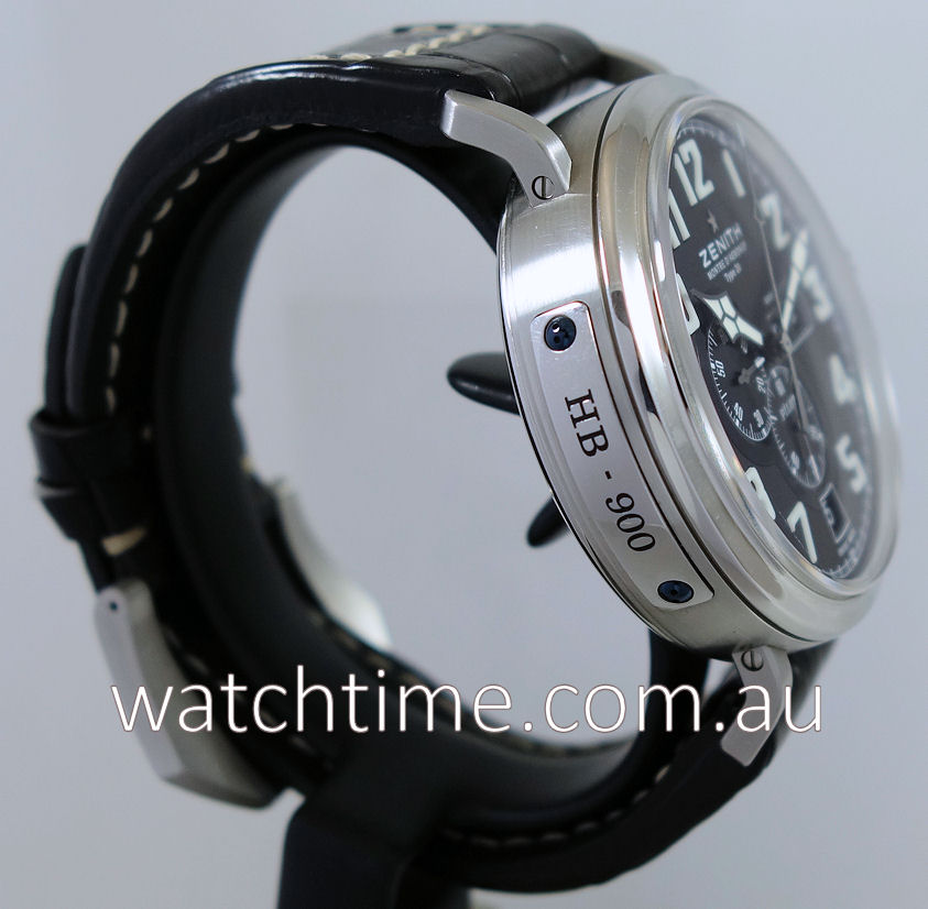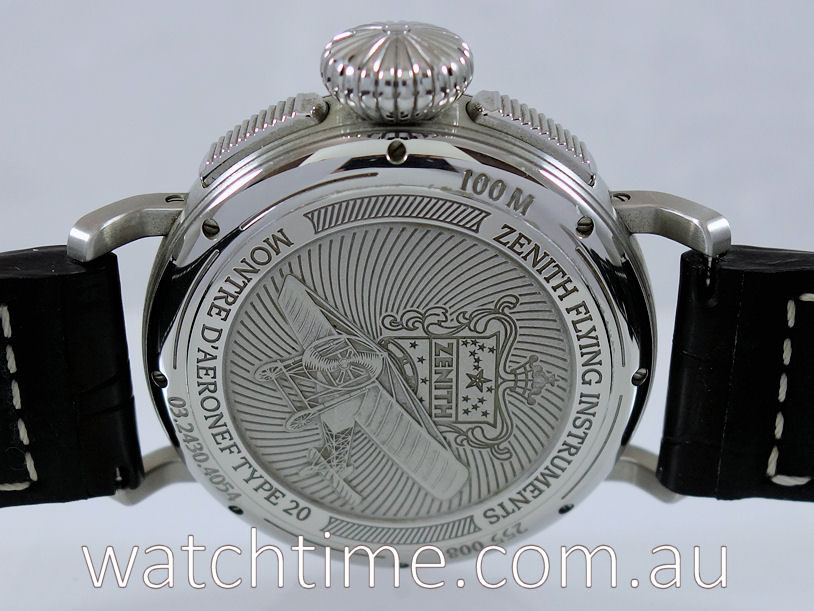 | Case | Stainless-steel with screw-in Onion style crown and squared pushers. Case-back engraved with Zenith aviation instruments. Domed sapphire crystal with anti-reflective treatment on both sides. |