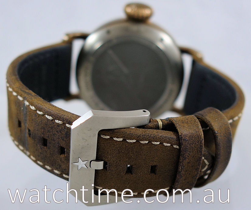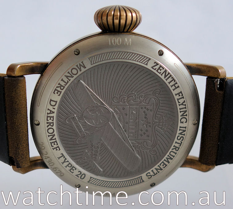 Brushed Bronze case with screw-in Onion style crown. Case-back engraved with the Zenith flying instruments logo. Domed sapphire crystal with anti-reflective treatment on both sides.