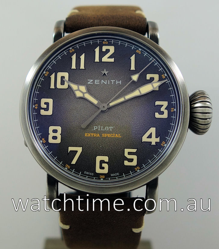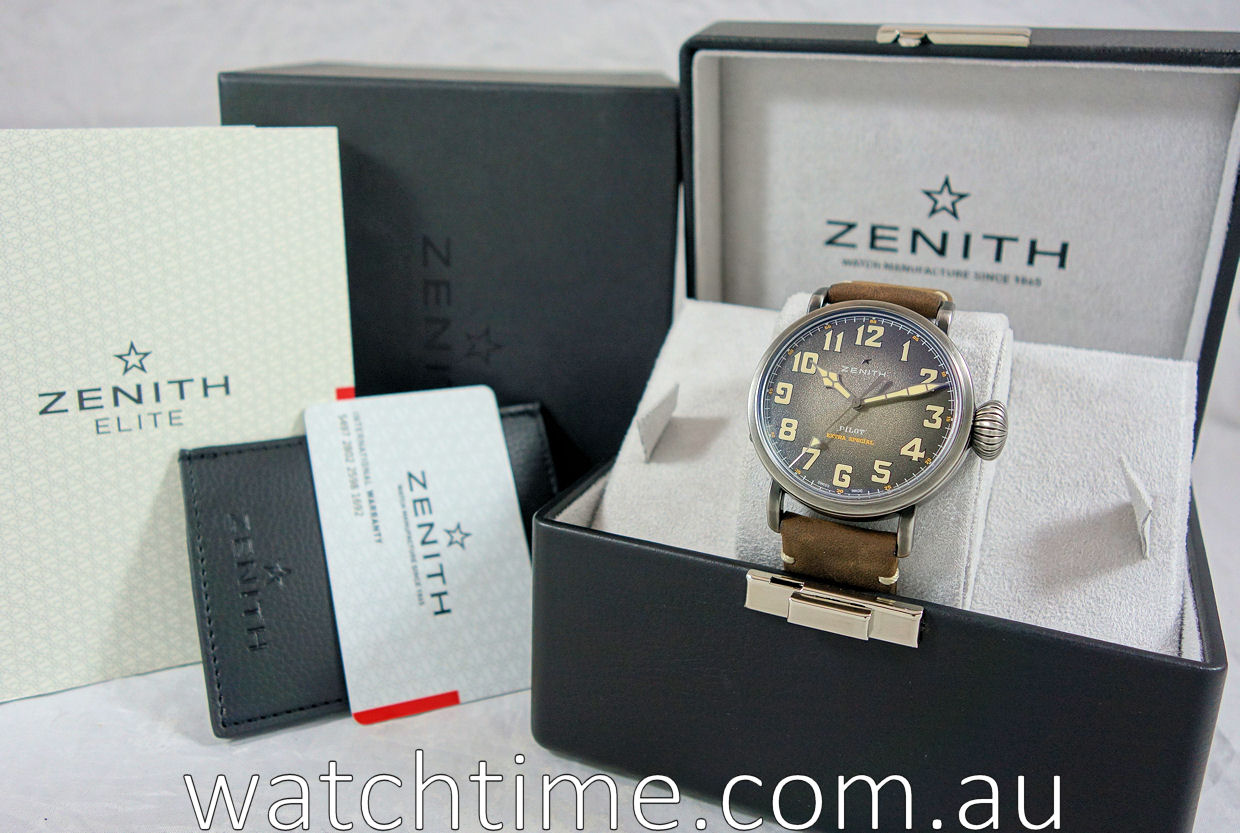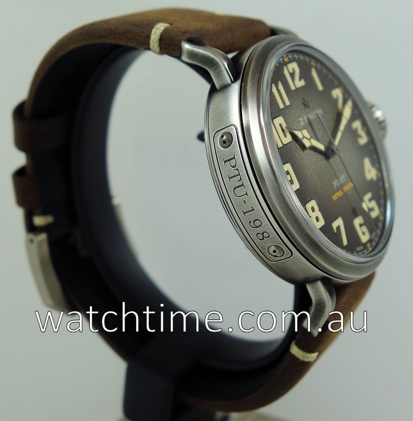 | Case | Aged stainless-steel case with screw-in Onion style crown. Case-back engraved with the Zenith flying instruments logo. Domed sapphire crystal with anti-reflective treatment on both sides. |