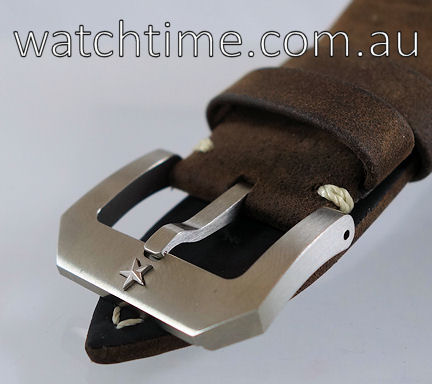 | Band | Brown oily nubuck leather strap with protective rubber lining, contrasting white-stitch and titanium pin buckle by Zenith. |