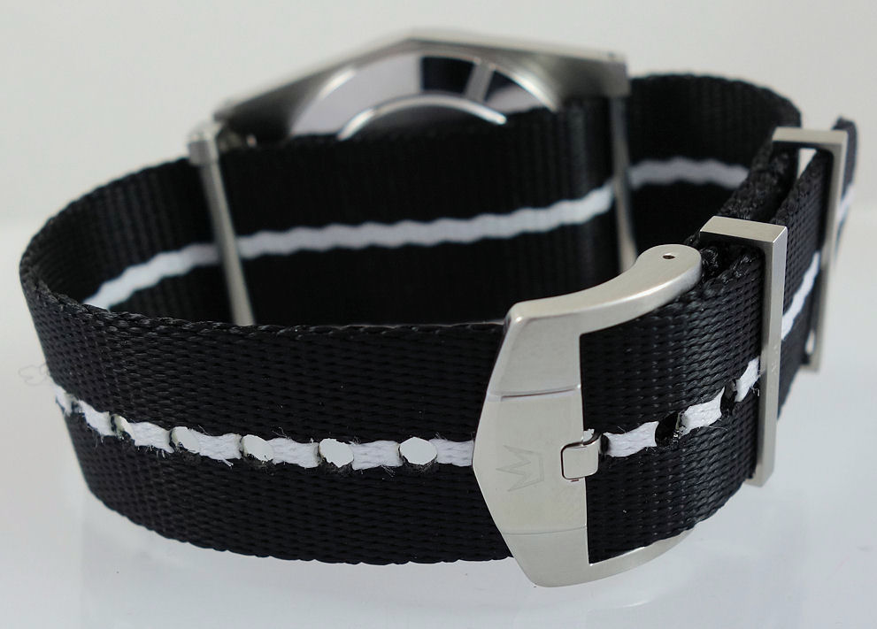 | Band | Black & white Nylon NATO strap and stee pin buckle. |